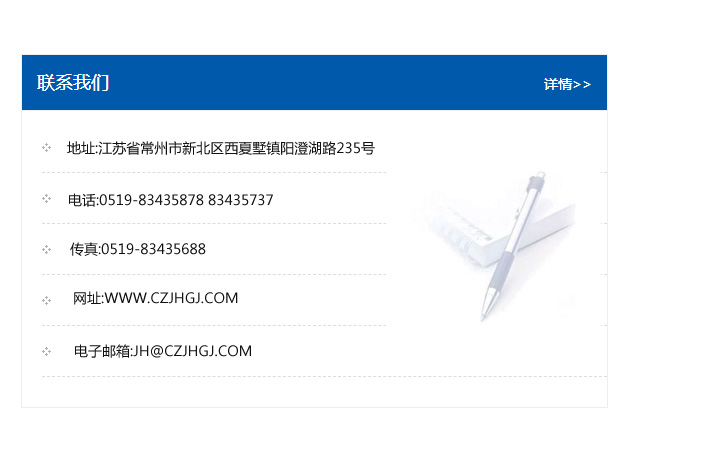 地址:常州市新北區友邦商務大廈1幢16、17層  電話:0519-85101652  傳真:0519-85112595  郵編:213022  網址:www.cz-jiayue_cn.hotsrq.com  郵箱:xiajifengaa@163.com